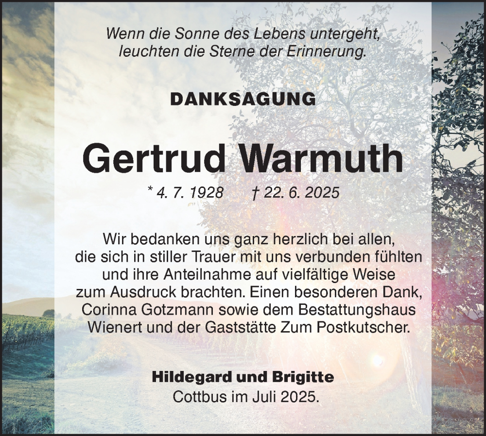Hier finden Sie alle Traueranzeigen aus der Zeitung, die bisher für Gertrud Warmuth erschienen sind. Weitere Traueranzeigen, die in der Zeitung erscheinen, werden hier ebenfalls aufgelistet
