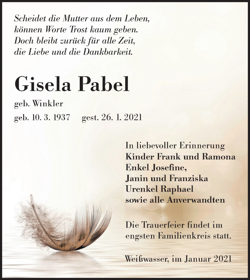 Hier finden Sie alle Traueranzeigen aus der Zeitung, die bisher für Gisela Pabel erschienen sind. Weitere Traueranzeigen, die in der Zeitung erscheinen, werden hier ebenfalls aufgelistet