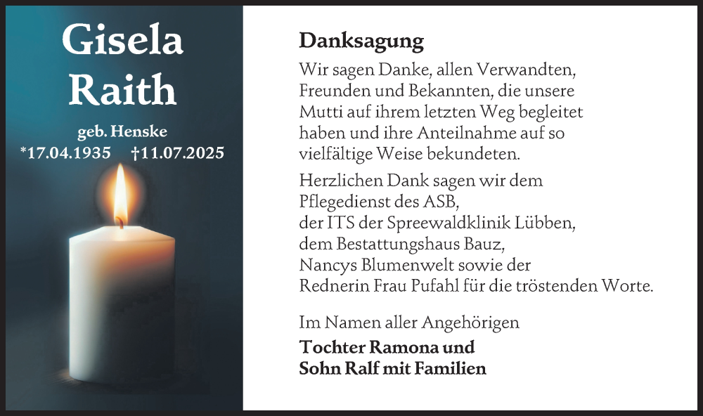 Hier finden Sie alle Traueranzeigen aus der Zeitung, die bisher für Gisela Raith erschienen sind. Weitere Traueranzeigen, die in der Zeitung erscheinen, werden hier ebenfalls aufgelistet