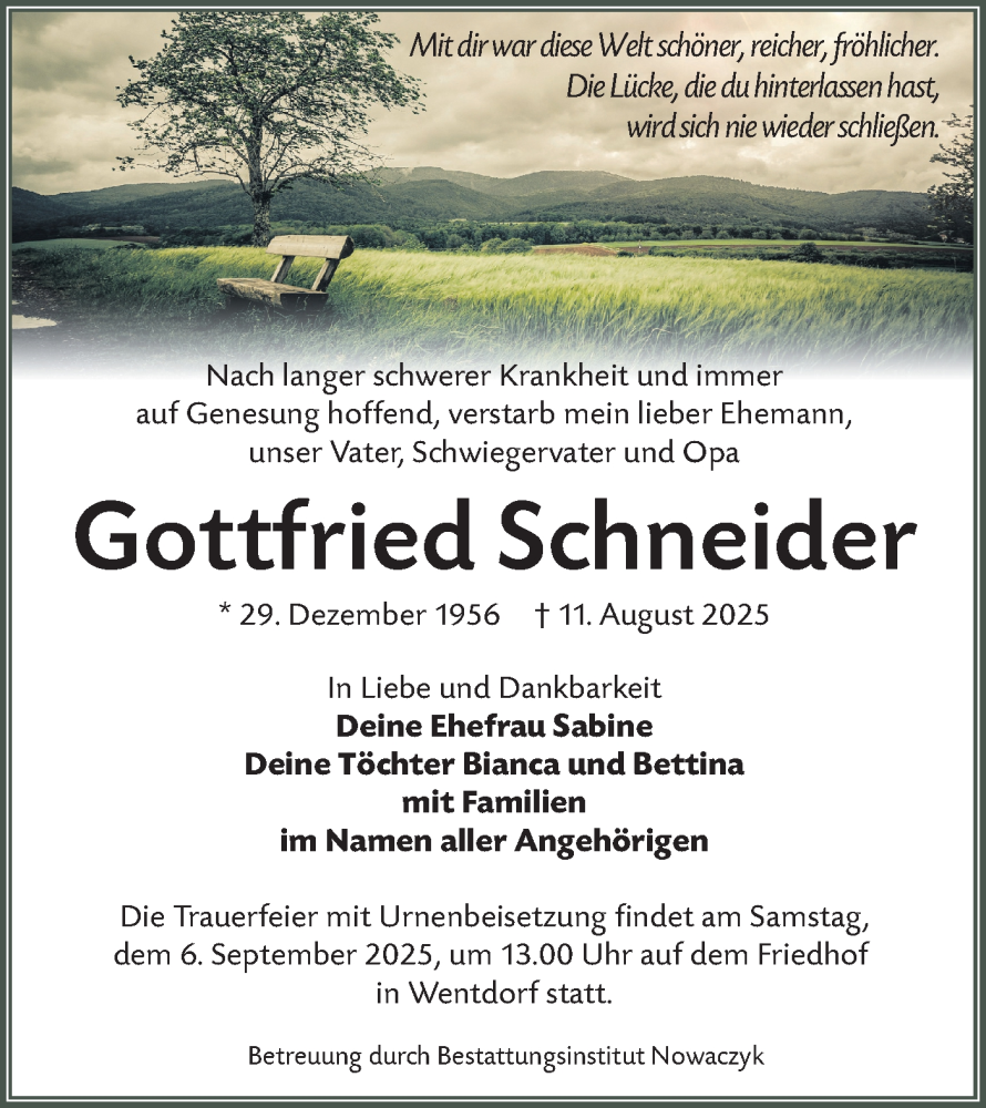 Hier finden Sie alle Traueranzeigen aus der Zeitung, die bisher für Gottfried Schneider erschienen sind. Weitere Traueranzeigen, die in der Zeitung erscheinen, werden hier ebenfalls aufgelistet