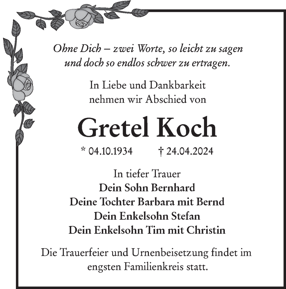 Hier finden Sie alle Traueranzeigen aus der Zeitung, die bisher für Gretel Koch erschienen sind. Weitere Traueranzeigen, die in der Zeitung erscheinen, werden hier ebenfalls aufgelistet