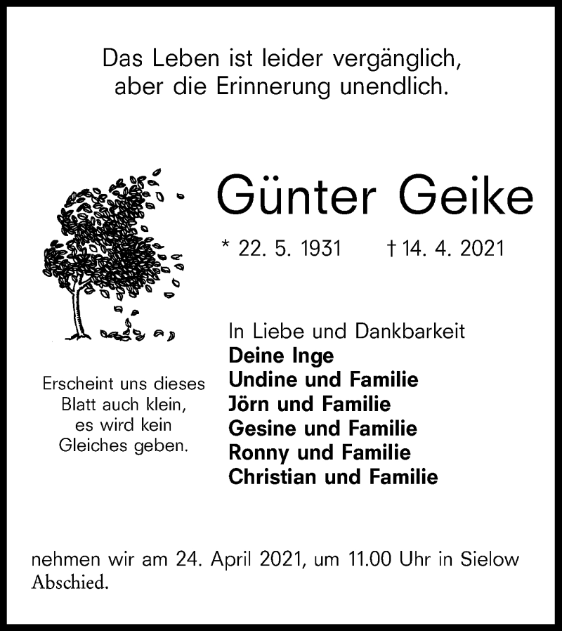 Hier finden Sie alle Traueranzeigen aus der Zeitung, die bisher für Günter Geike erschienen sind. Weitere Traueranzeigen, die in der Zeitung erscheinen, werden hier ebenfalls aufgelistet