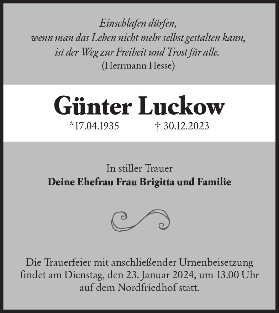 Hier finden Sie alle Traueranzeigen aus der Zeitung, die bisher für Günter Luckow erschienen sind. Weitere Traueranzeigen, die in der Zeitung erscheinen, werden hier ebenfalls aufgelistet