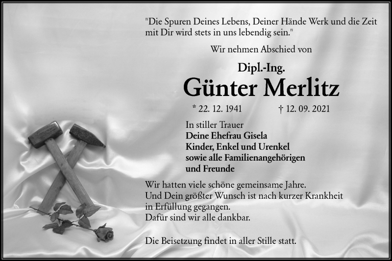 Hier finden Sie alle Traueranzeigen aus der Zeitung, die bisher für Günter Merlitz erschienen sind. Weitere Traueranzeigen, die in der Zeitung erscheinen, werden hier ebenfalls aufgelistet