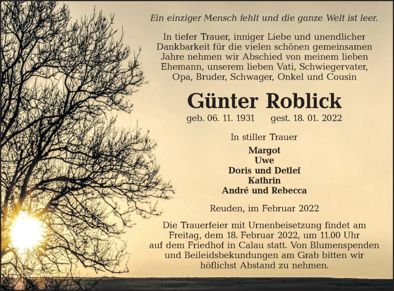 Hier finden Sie alle Traueranzeigen aus der Zeitung, die bisher für Günter Roblick erschienen sind. Weitere Traueranzeigen, die in der Zeitung erscheinen, werden hier ebenfalls aufgelistet