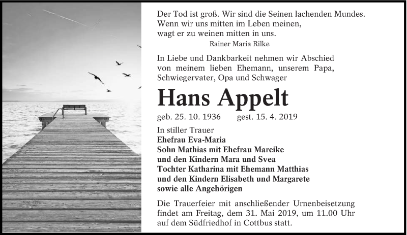 Hier finden Sie alle Traueranzeigen aus der Zeitung, die bisher für Hans Appelt erschienen sind. Weitere Traueranzeigen, die in der Zeitung erscheinen, werden hier ebenfalls aufgelistet