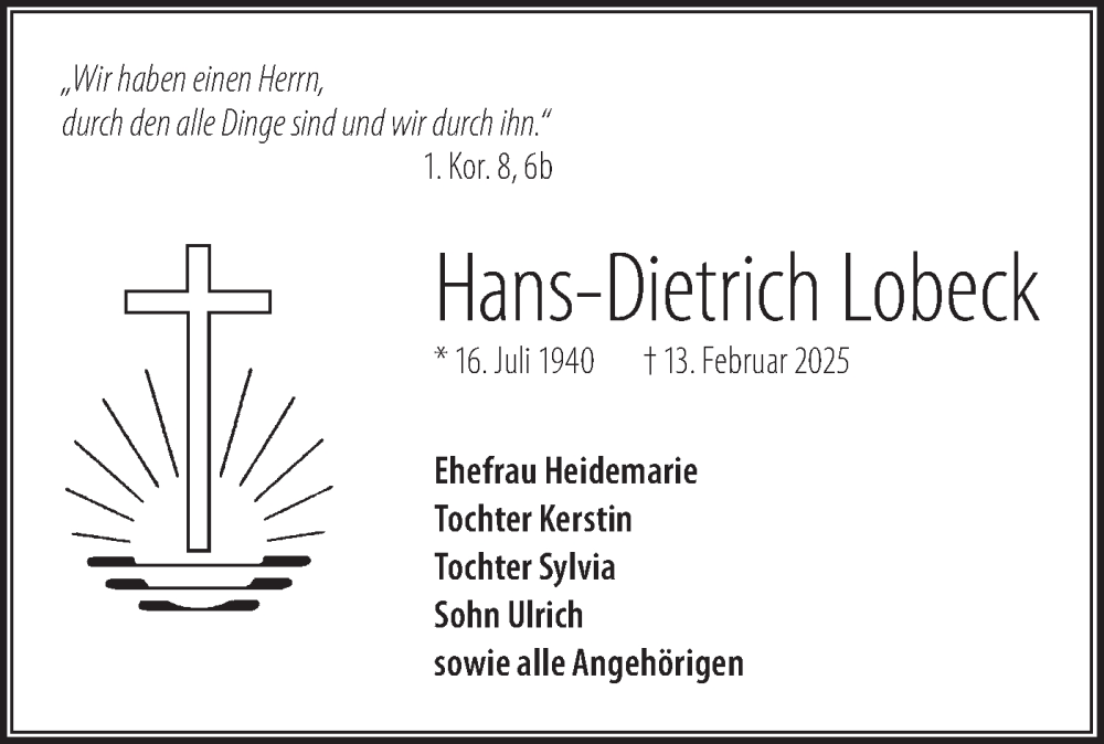 Hier finden Sie alle Traueranzeigen aus der Zeitung, die bisher für Hans-Dietrich Lobeck erschienen sind. Weitere Traueranzeigen, die in der Zeitung erscheinen, werden hier ebenfalls aufgelistet