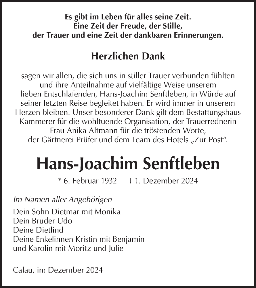 Hier finden Sie alle Traueranzeigen aus der Zeitung, die bisher für Hans-Joachim Senftleben erschienen sind. Weitere Traueranzeigen, die in der Zeitung erscheinen, werden hier ebenfalls aufgelistet