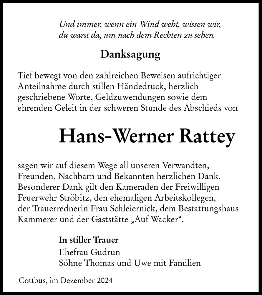 Hier finden Sie alle Traueranzeigen aus der Zeitung, die bisher für Hans-Werner Rattey erschienen sind. Weitere Traueranzeigen, die in der Zeitung erscheinen, werden hier ebenfalls aufgelistet