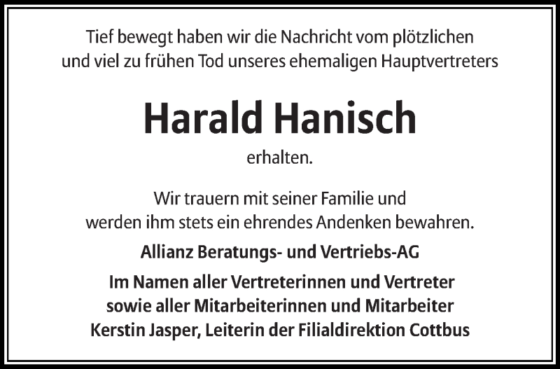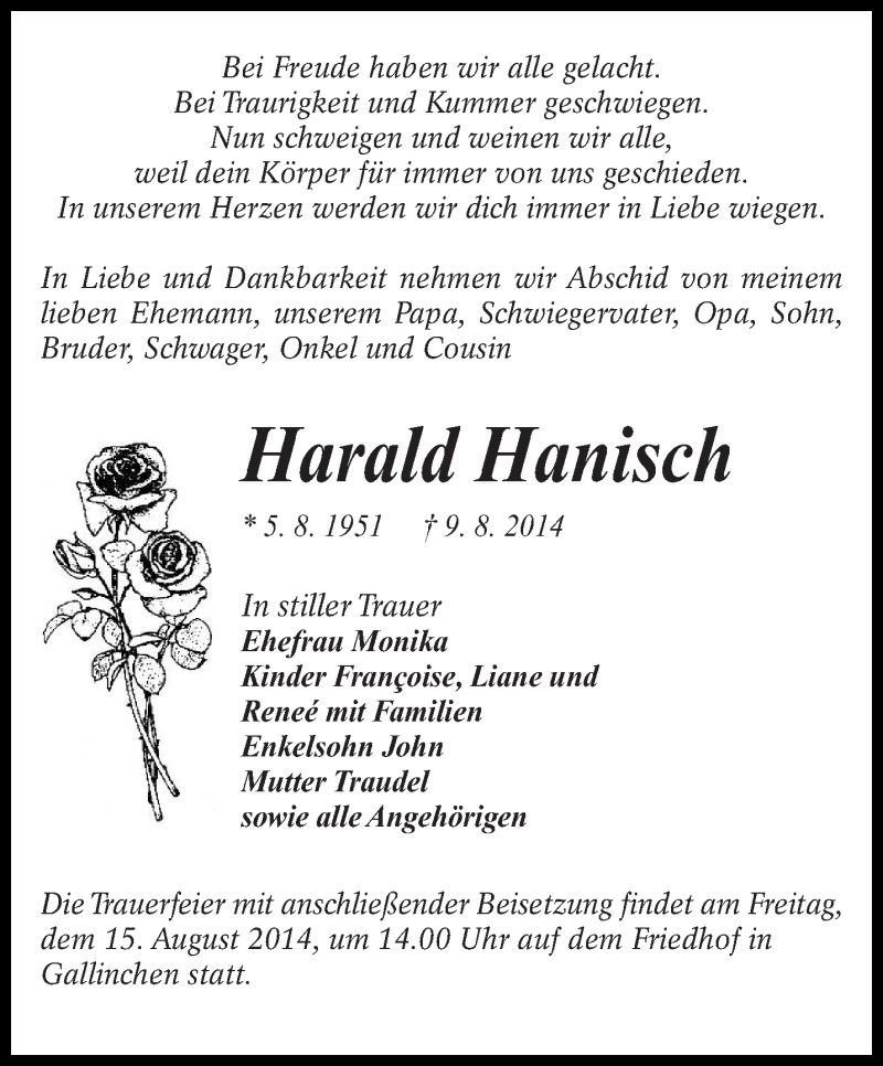 Hier finden Sie alle Traueranzeigen aus der Zeitung, die bisher für Harald Hanisch erschienen sind. Weitere Traueranzeigen, die in der Zeitung erscheinen, werden hier ebenfalls aufgelistet