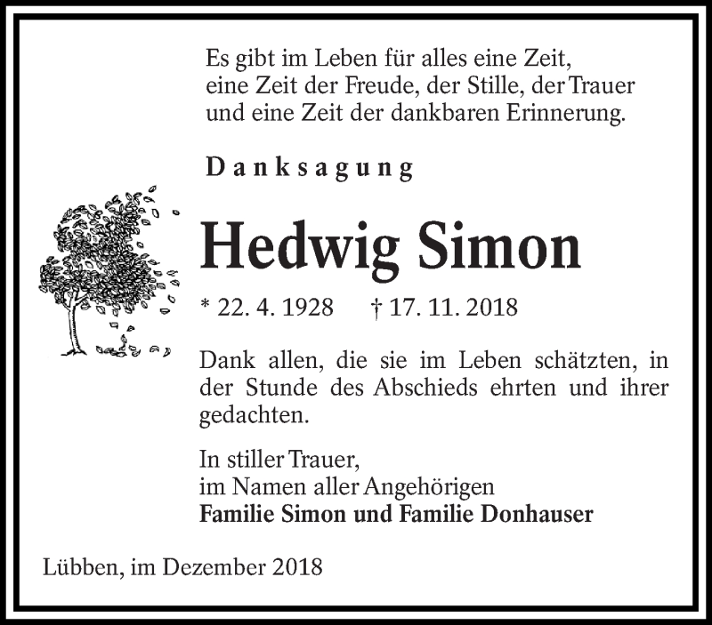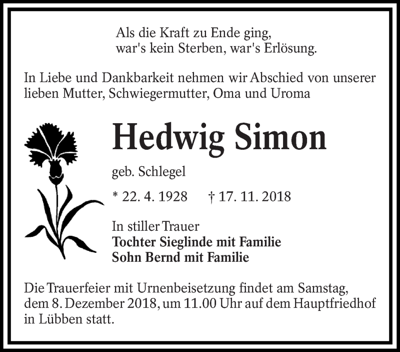 Hier finden Sie alle Traueranzeigen aus der Zeitung, die bisher für Hedwig Simon erschienen sind. Weitere Traueranzeigen, die in der Zeitung erscheinen, werden hier ebenfalls aufgelistet