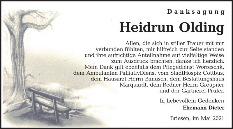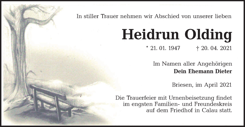 Hier finden Sie alle Traueranzeigen aus der Zeitung, die bisher für Heidrun Olding erschienen sind. Weitere Traueranzeigen, die in der Zeitung erscheinen, werden hier ebenfalls aufgelistet