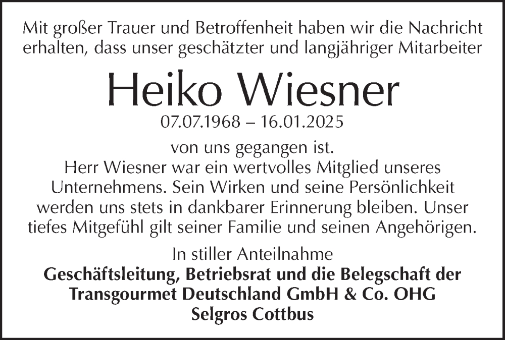 Hier finden Sie alle Traueranzeigen aus der Zeitung, die bisher für Heiko Wiesner erschienen sind. Weitere Traueranzeigen, die in der Zeitung erscheinen, werden hier ebenfalls aufgelistet