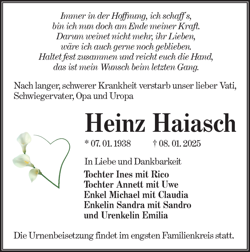 Hier finden Sie alle Traueranzeigen aus der Zeitung, die bisher für Heinz Haiasch erschienen sind. Weitere Traueranzeigen, die in der Zeitung erscheinen, werden hier ebenfalls aufgelistet