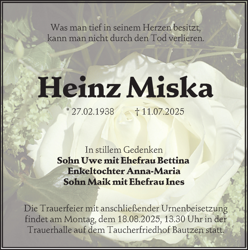 Hier finden Sie alle Traueranzeigen aus der Zeitung, die bisher für Heinz Miska erschienen sind. Weitere Traueranzeigen, die in der Zeitung erscheinen, werden hier ebenfalls aufgelistet