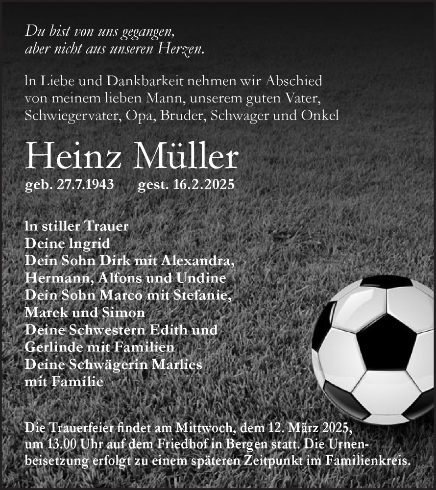 Hier finden Sie alle Traueranzeigen aus der Zeitung, die bisher für Heinz Müller erschienen sind. Weitere Traueranzeigen, die in der Zeitung erscheinen, werden hier ebenfalls aufgelistet