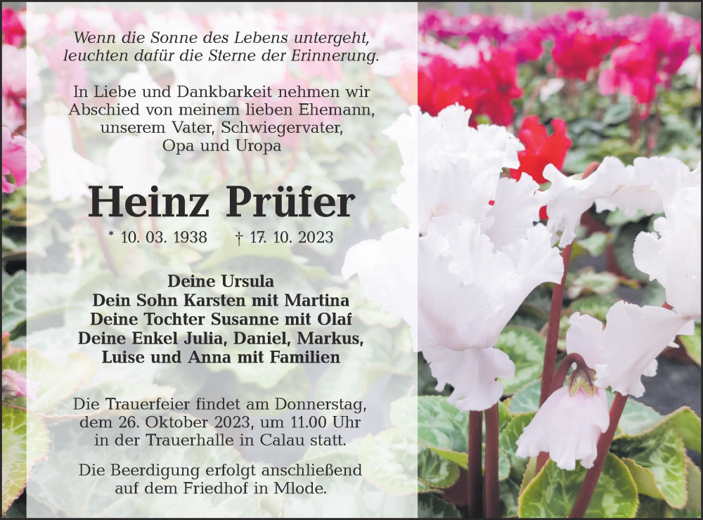 Hier finden Sie alle Traueranzeigen aus der Zeitung, die bisher für Heinz Prüfer erschienen sind. Weitere Traueranzeigen, die in der Zeitung erscheinen, werden hier ebenfalls aufgelistet