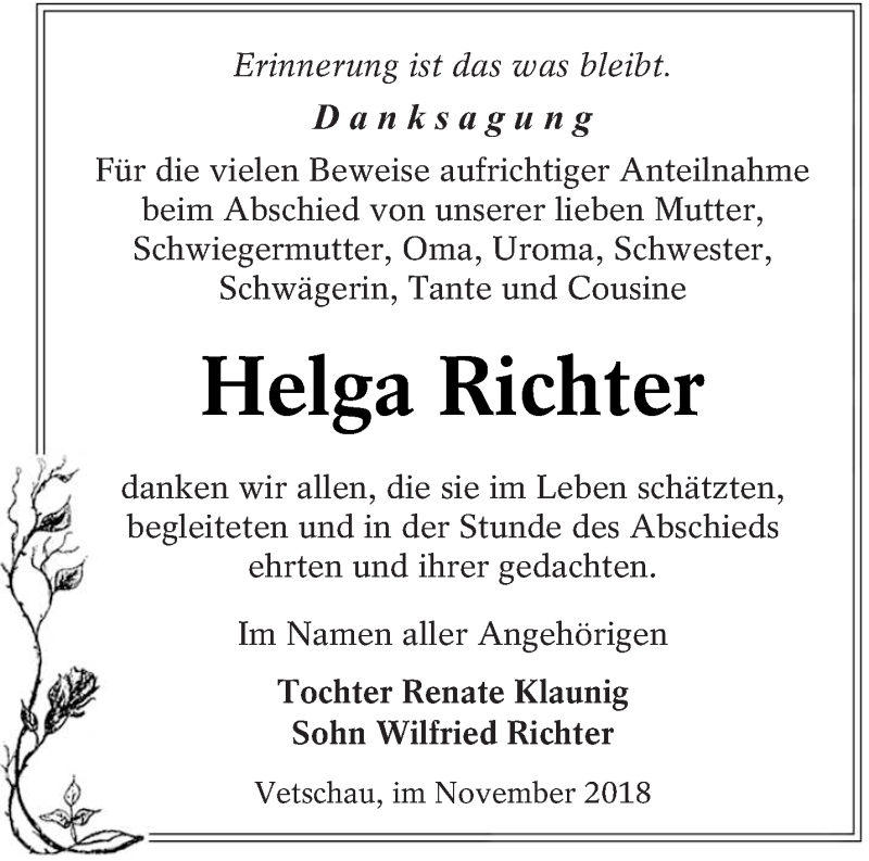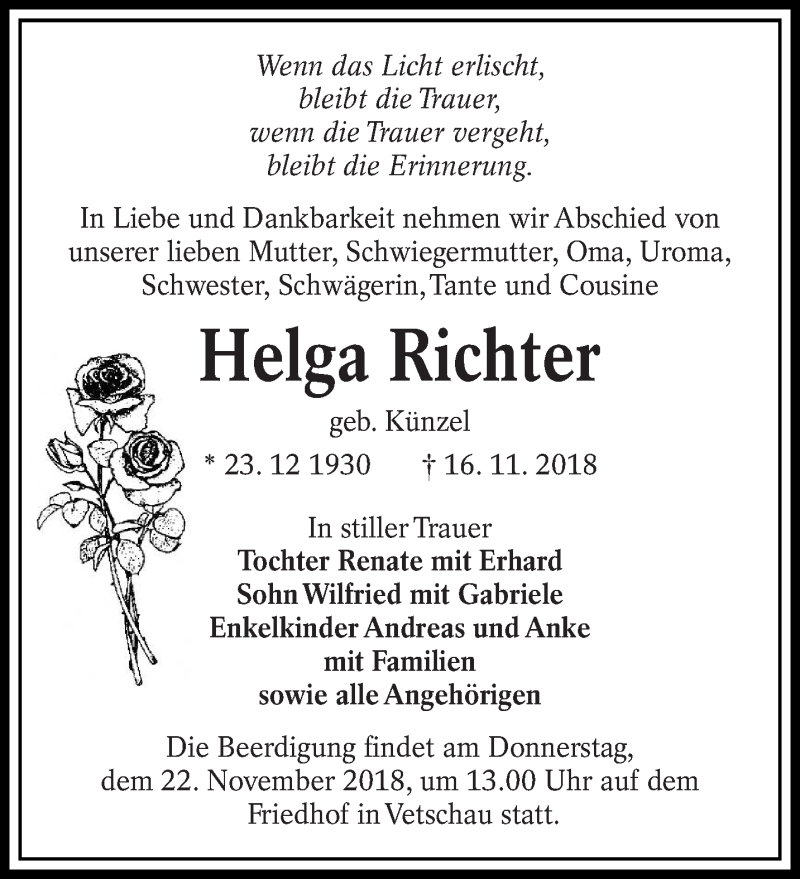 Hier finden Sie alle Traueranzeigen aus der Zeitung, die bisher für Helga Richter erschienen sind. Weitere Traueranzeigen, die in der Zeitung erscheinen, werden hier ebenfalls aufgelistet