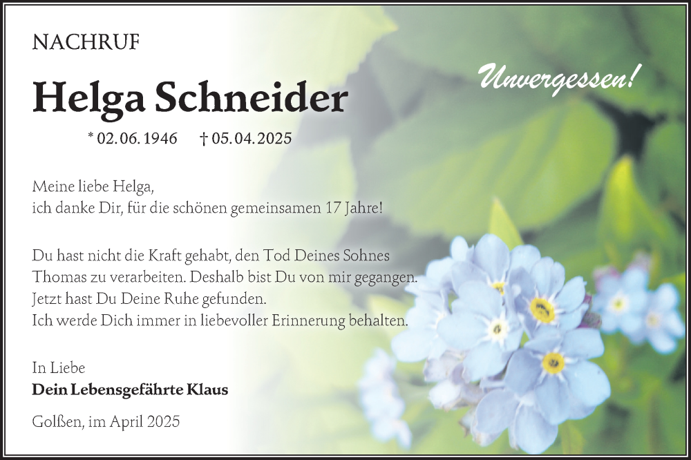 Hier finden Sie alle Traueranzeigen aus der Zeitung, die bisher für Helga Schneider erschienen sind. Weitere Traueranzeigen, die in der Zeitung erscheinen, werden hier ebenfalls aufgelistet