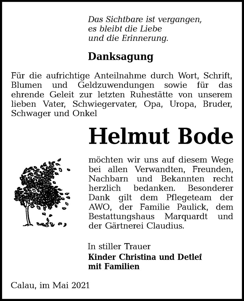 Hier finden Sie alle Traueranzeigen aus der Zeitung, die bisher für Helmut Bode erschienen sind. Weitere Traueranzeigen, die in der Zeitung erscheinen, werden hier ebenfalls aufgelistet