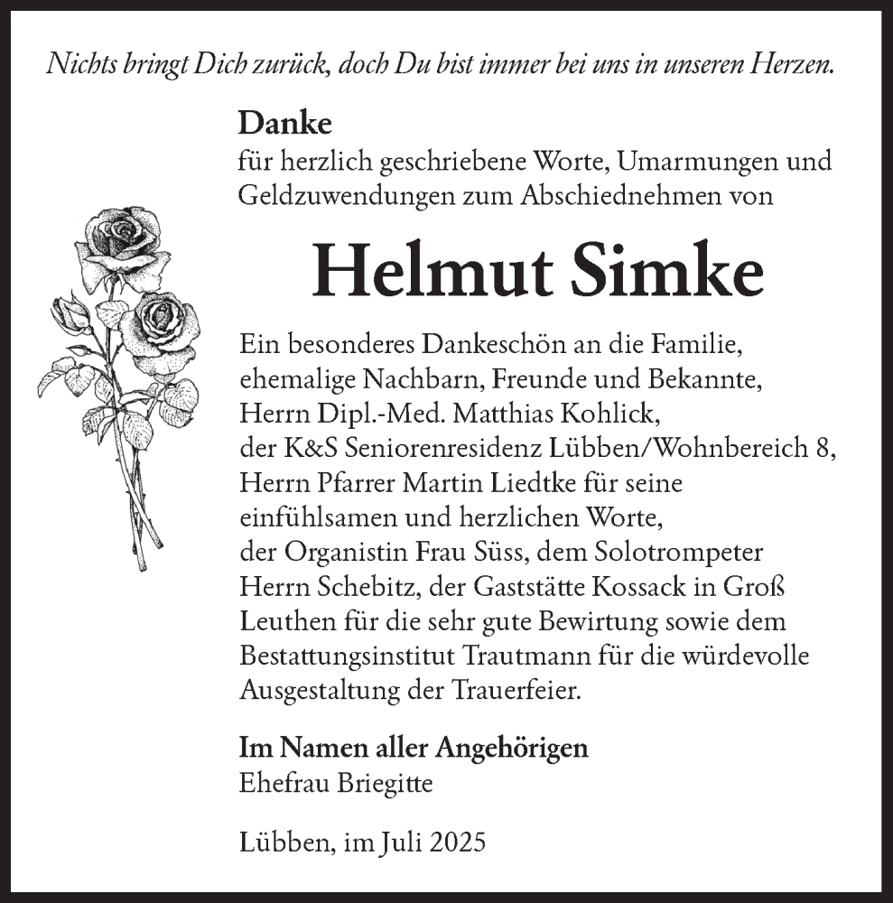 Hier finden Sie alle Traueranzeigen aus der Zeitung, die bisher für Helmut Simke erschienen sind. Weitere Traueranzeigen, die in der Zeitung erscheinen, werden hier ebenfalls aufgelistet