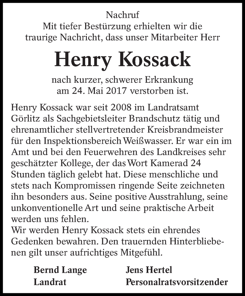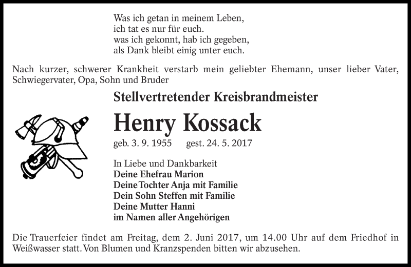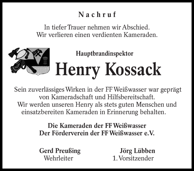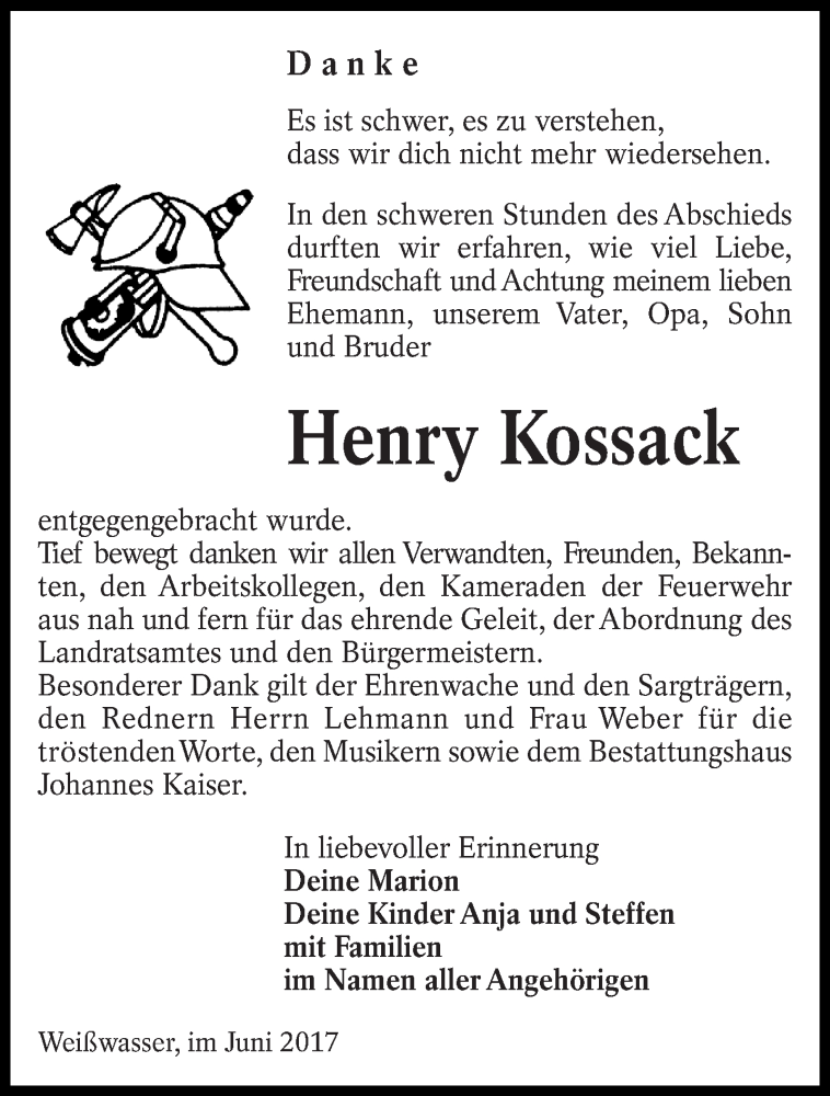 Hier finden Sie alle Traueranzeigen aus der Zeitung, die bisher für Henry Kossack erschienen sind. Weitere Traueranzeigen, die in der Zeitung erscheinen, werden hier ebenfalls aufgelistet