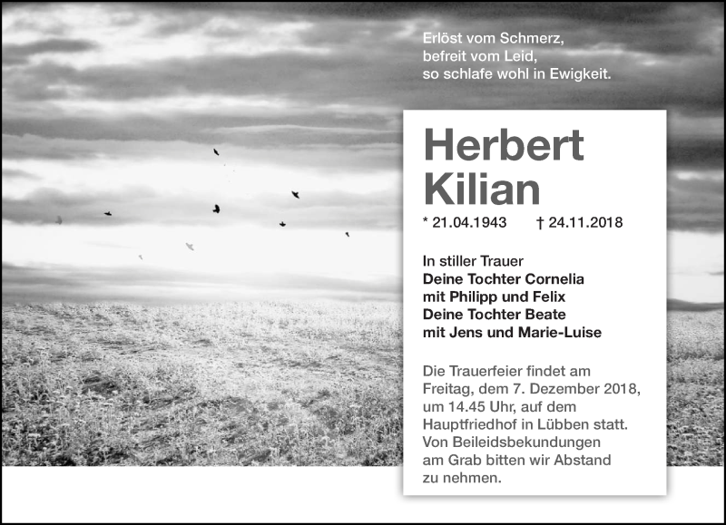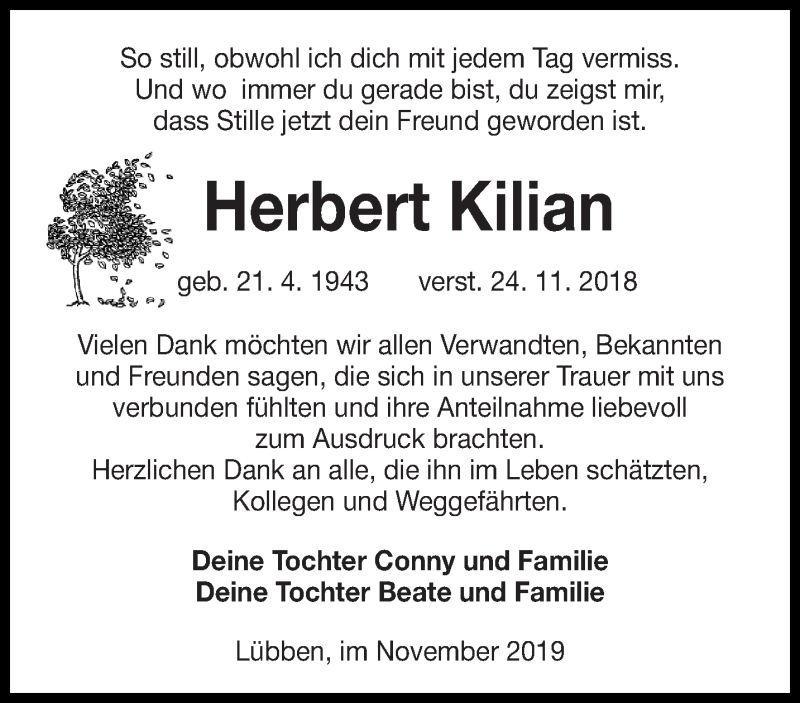 Hier finden Sie alle Traueranzeigen aus der Zeitung, die bisher für Herbert Kilian erschienen sind. Weitere Traueranzeigen, die in der Zeitung erscheinen, werden hier ebenfalls aufgelistet