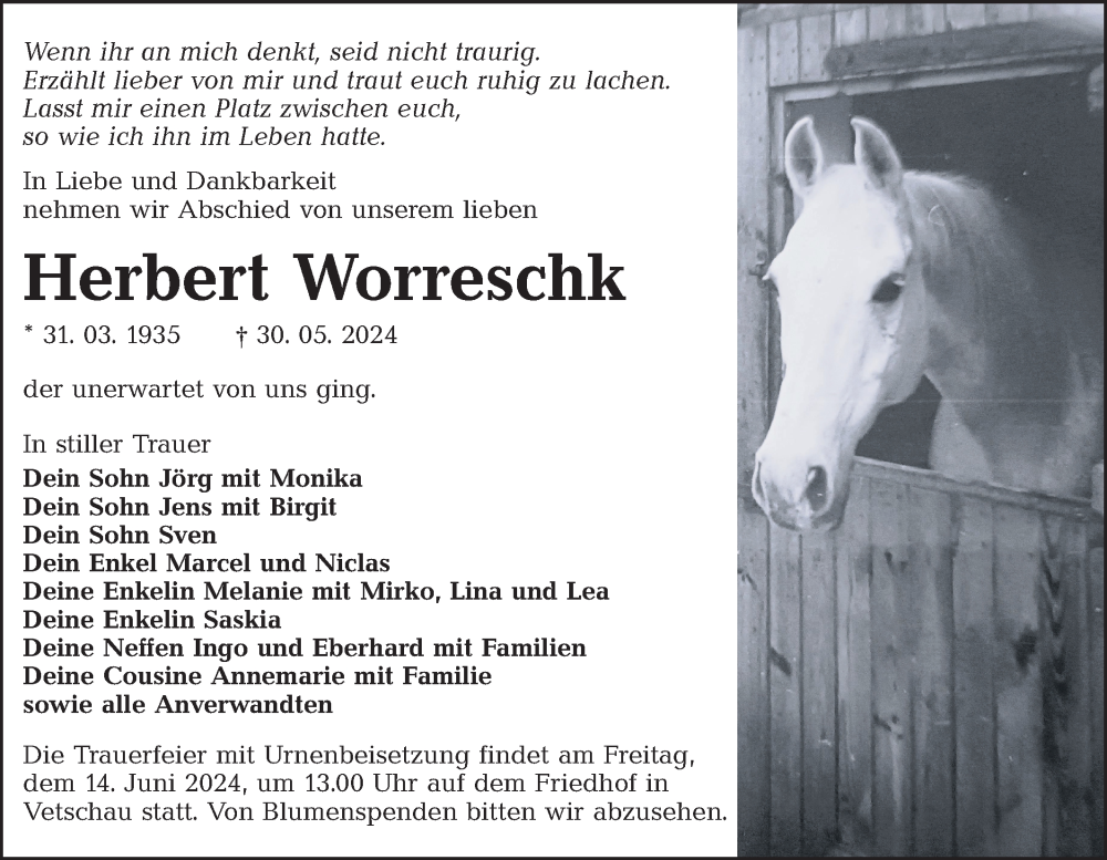 Hier finden Sie alle Traueranzeigen aus der Zeitung, die bisher für Herbert Worreschk erschienen sind. Weitere Traueranzeigen, die in der Zeitung erscheinen, werden hier ebenfalls aufgelistet