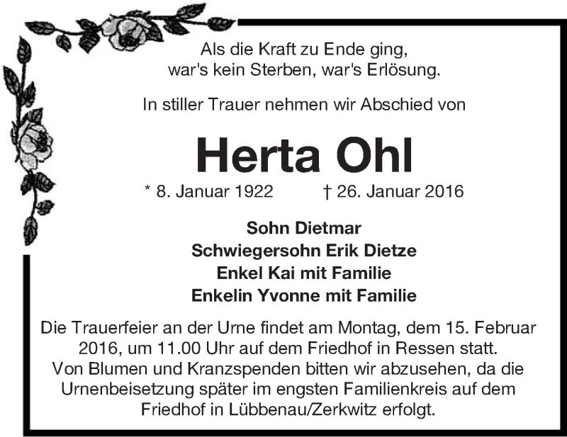 Hier finden Sie alle Traueranzeigen aus der Zeitung, die bisher für Herta Ohl erschienen sind. Weitere Traueranzeigen, die in der Zeitung erscheinen, werden hier ebenfalls aufgelistet