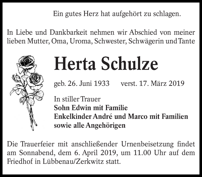 Hier finden Sie alle Traueranzeigen aus der Zeitung, die bisher für Herta Schulze erschienen sind. Weitere Traueranzeigen, die in der Zeitung erscheinen, werden hier ebenfalls aufgelistet