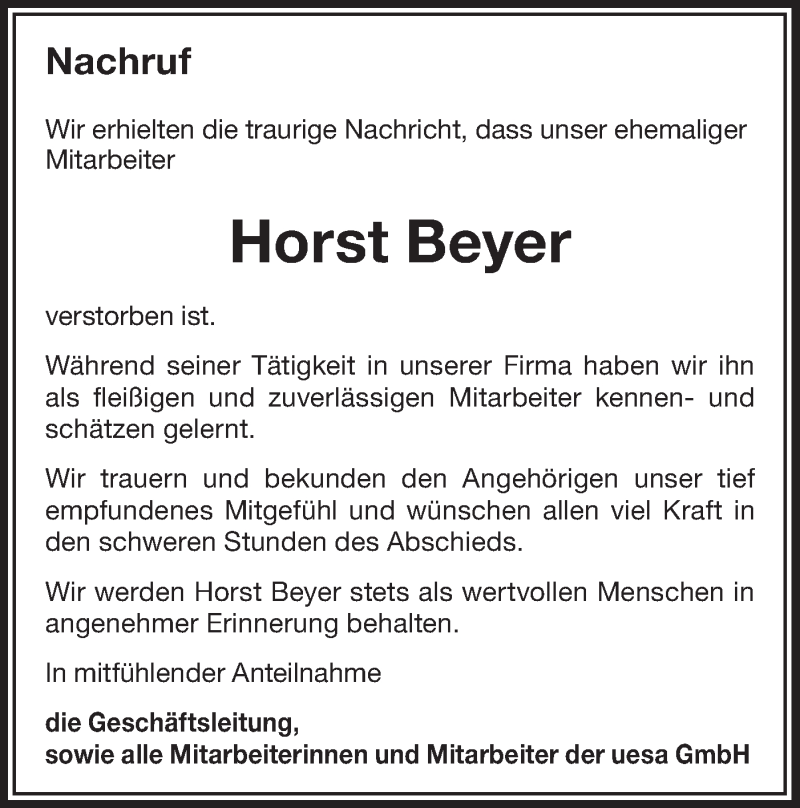 Hier finden Sie alle Traueranzeigen aus der Zeitung, die bisher für Horst Beyer erschienen sind. Weitere Traueranzeigen, die in der Zeitung erscheinen, werden hier ebenfalls aufgelistet