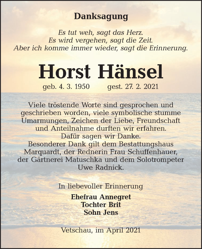 Hier finden Sie alle Traueranzeigen aus der Zeitung, die bisher für Horst Hänsel erschienen sind. Weitere Traueranzeigen, die in der Zeitung erscheinen, werden hier ebenfalls aufgelistet