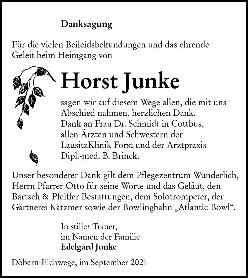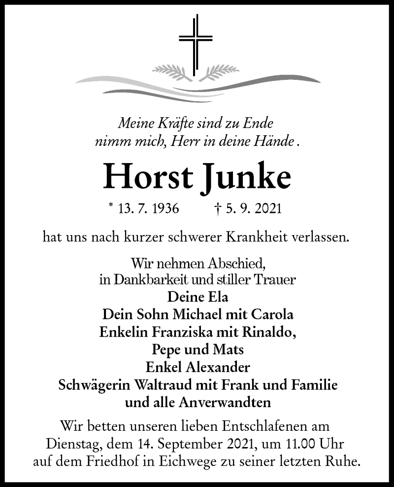 Hier finden Sie alle Traueranzeigen aus der Zeitung, die bisher für Horst Junke erschienen sind. Weitere Traueranzeigen, die in der Zeitung erscheinen, werden hier ebenfalls aufgelistet