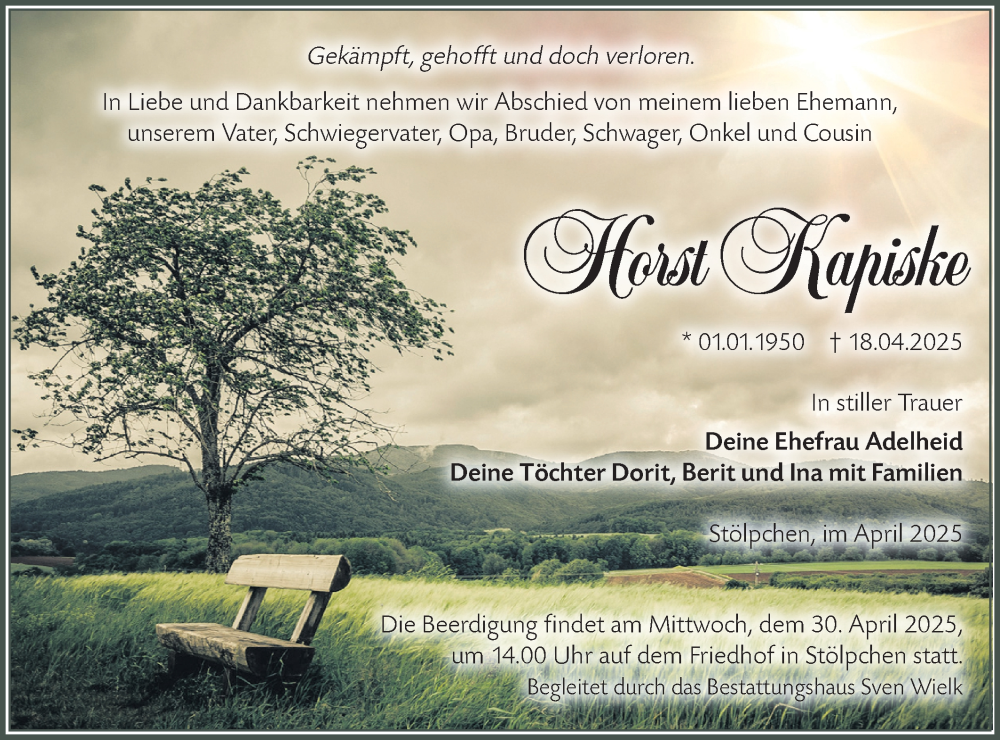 Hier finden Sie alle Traueranzeigen aus der Zeitung, die bisher für Horst Kapiske erschienen sind. Weitere Traueranzeigen, die in der Zeitung erscheinen, werden hier ebenfalls aufgelistet
