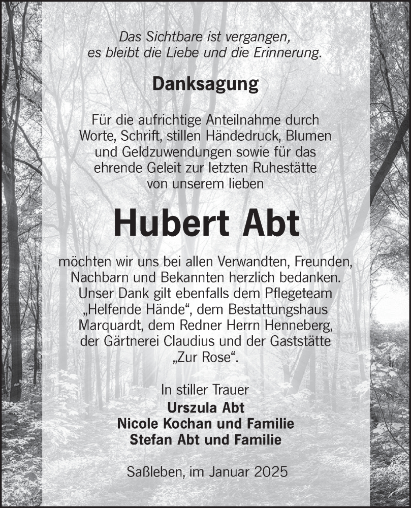 Hier finden Sie alle Traueranzeigen aus der Zeitung, die bisher für Hubert Abt erschienen sind. Weitere Traueranzeigen, die in der Zeitung erscheinen, werden hier ebenfalls aufgelistet