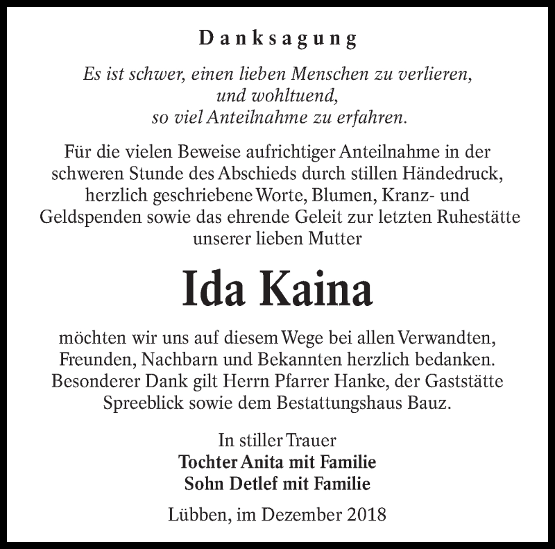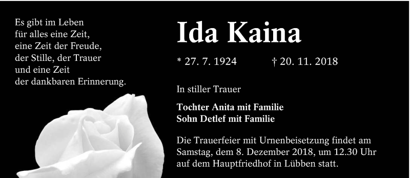 Hier finden Sie alle Traueranzeigen aus der Zeitung, die bisher für Ida Kaina erschienen sind. Weitere Traueranzeigen, die in der Zeitung erscheinen, werden hier ebenfalls aufgelistet