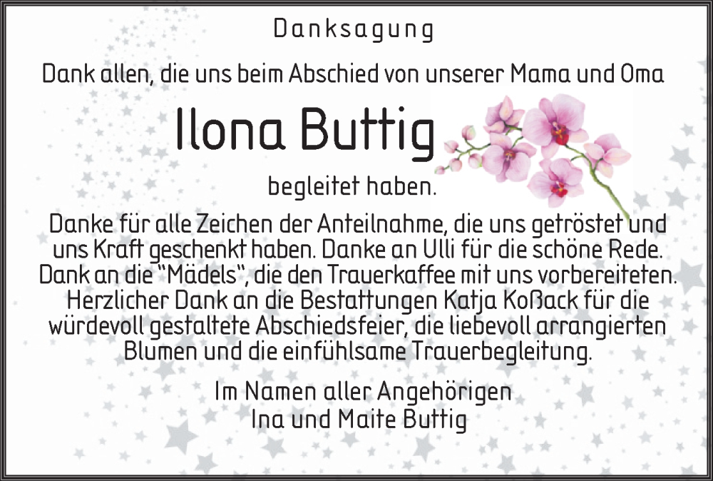 Hier finden Sie alle Traueranzeigen aus der Zeitung, die bisher für Ilona Buttig erschienen sind. Weitere Traueranzeigen, die in der Zeitung erscheinen, werden hier ebenfalls aufgelistet
