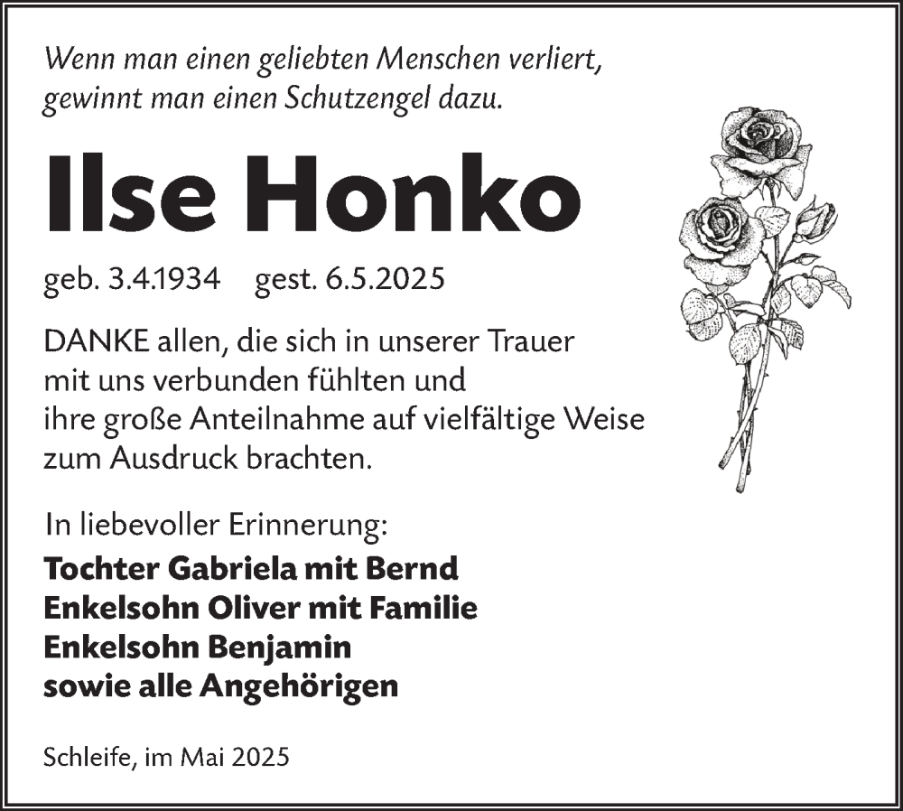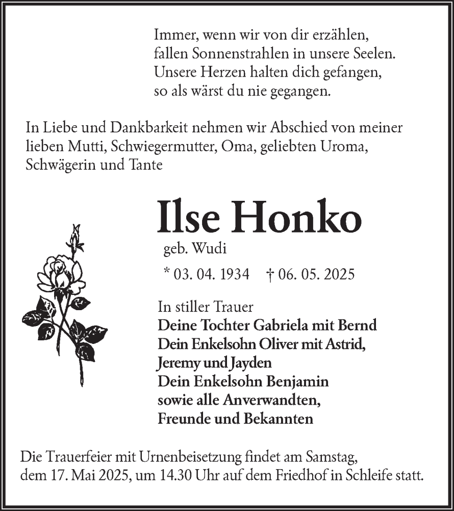 Hier finden Sie alle Traueranzeigen aus der Zeitung, die bisher für Ilse Honko erschienen sind. Weitere Traueranzeigen, die in der Zeitung erscheinen, werden hier ebenfalls aufgelistet