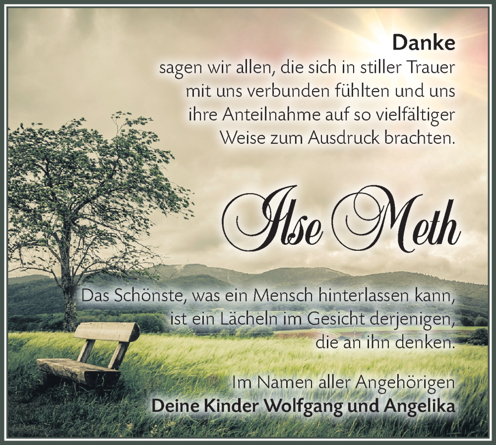 Hier finden Sie alle Traueranzeigen aus der Zeitung, die bisher für Ilse Meth erschienen sind. Weitere Traueranzeigen, die in der Zeitung erscheinen, werden hier ebenfalls aufgelistet