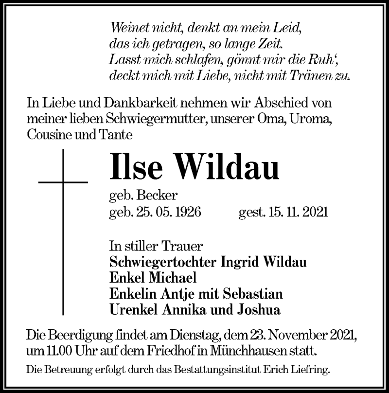 Hier finden Sie alle Traueranzeigen aus der Zeitung, die bisher für Ilse Wildau erschienen sind. Weitere Traueranzeigen, die in der Zeitung erscheinen, werden hier ebenfalls aufgelistet