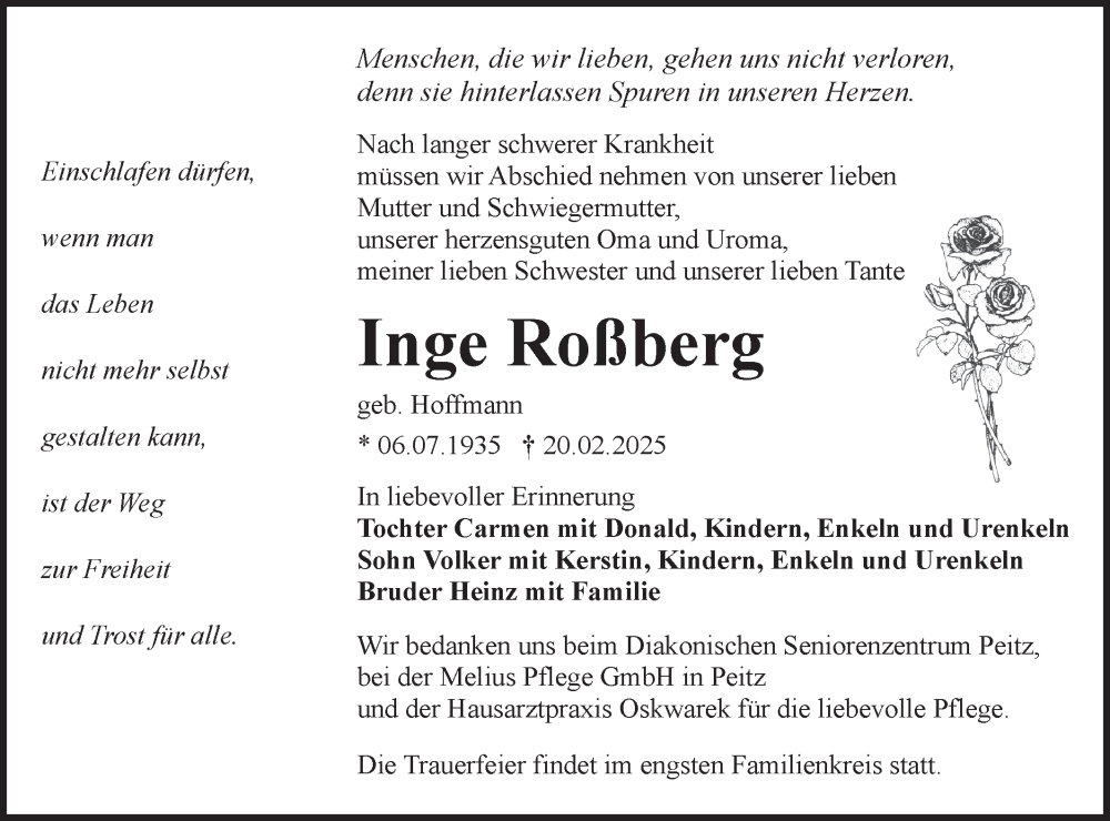 Hier finden Sie alle Traueranzeigen aus der Zeitung, die bisher für Inge Roßberg erschienen sind. Weitere Traueranzeigen, die in der Zeitung erscheinen, werden hier ebenfalls aufgelistet