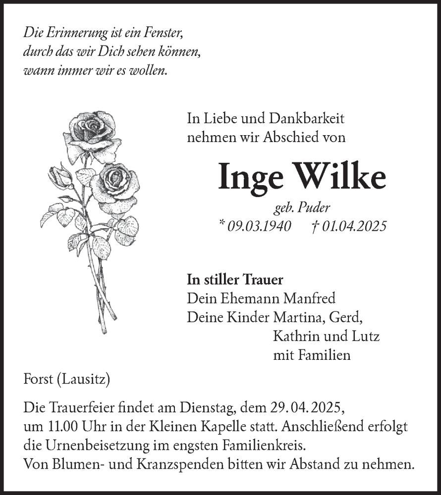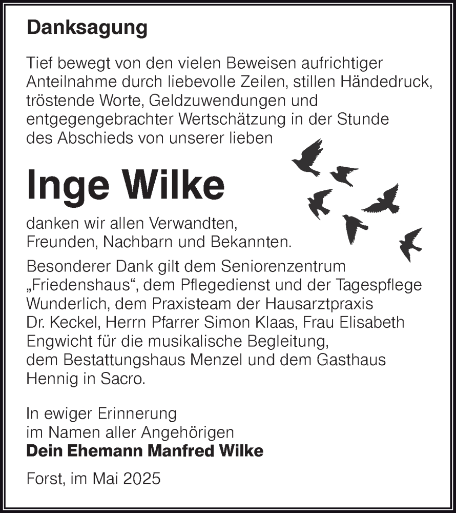 Hier finden Sie alle Traueranzeigen aus der Zeitung, die bisher für Inge Wilke erschienen sind. Weitere Traueranzeigen, die in der Zeitung erscheinen, werden hier ebenfalls aufgelistet