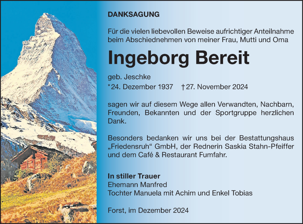 Hier finden Sie alle Traueranzeigen aus der Zeitung, die bisher für Ingeborg Bereit erschienen sind. Weitere Traueranzeigen, die in der Zeitung erscheinen, werden hier ebenfalls aufgelistet