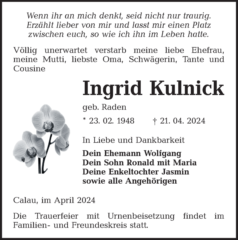Hier finden Sie alle Traueranzeigen aus der Zeitung, die bisher für Ingrid Kulnick erschienen sind. Weitere Traueranzeigen, die in der Zeitung erscheinen, werden hier ebenfalls aufgelistet