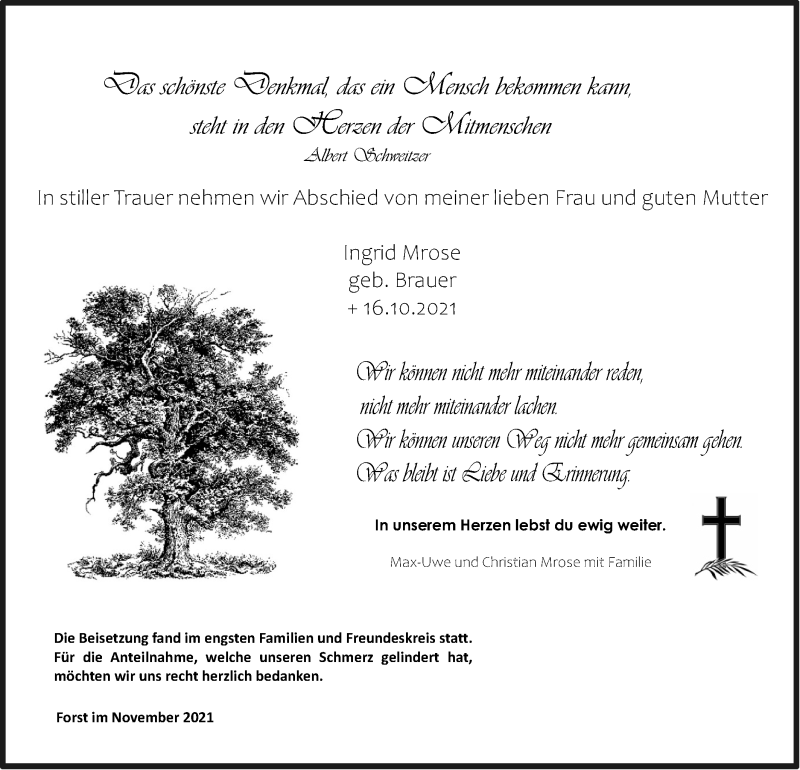 Hier finden Sie alle Traueranzeigen aus der Zeitung, die bisher für Ingrid Mrose erschienen sind. Weitere Traueranzeigen, die in der Zeitung erscheinen, werden hier ebenfalls aufgelistet