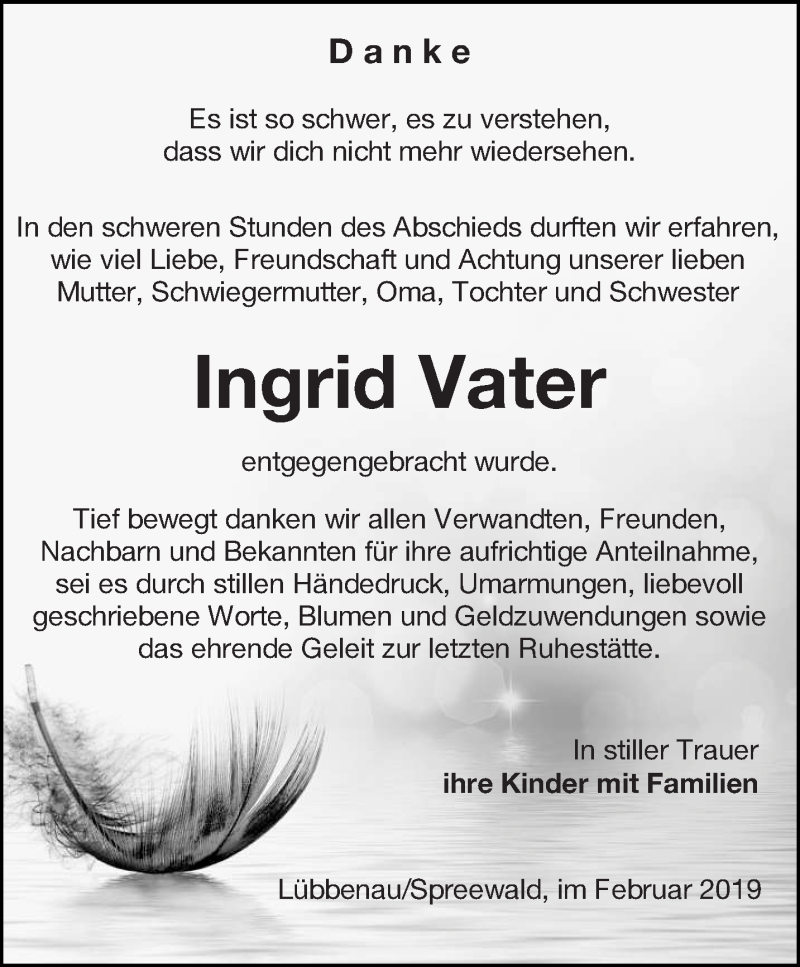 Hier finden Sie alle Traueranzeigen aus der Zeitung, die bisher für Ingrid Vater erschienen sind. Weitere Traueranzeigen, die in der Zeitung erscheinen, werden hier ebenfalls aufgelistet