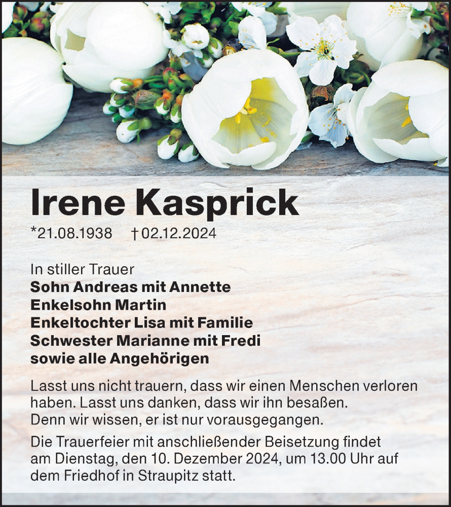 Hier finden Sie alle Traueranzeigen aus der Zeitung, die bisher für Irene Kasprick erschienen sind. Weitere Traueranzeigen, die in der Zeitung erscheinen, werden hier ebenfalls aufgelistet