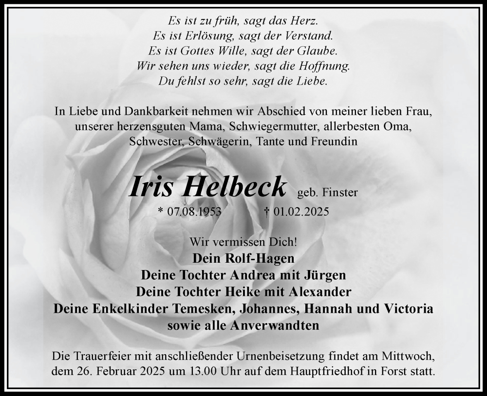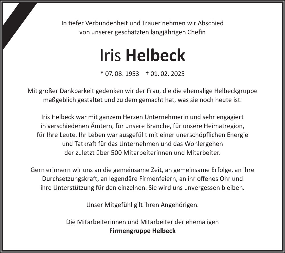Hier finden Sie alle Traueranzeigen aus der Zeitung, die bisher für Iris Helbeck erschienen sind. Weitere Traueranzeigen, die in der Zeitung erscheinen, werden hier ebenfalls aufgelistet
