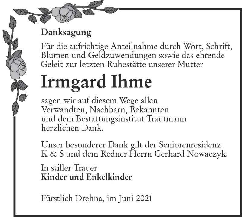 Hier finden Sie alle Traueranzeigen aus der Zeitung, die bisher für Irmgard Ihme erschienen sind. Weitere Traueranzeigen, die in der Zeitung erscheinen, werden hier ebenfalls aufgelistet