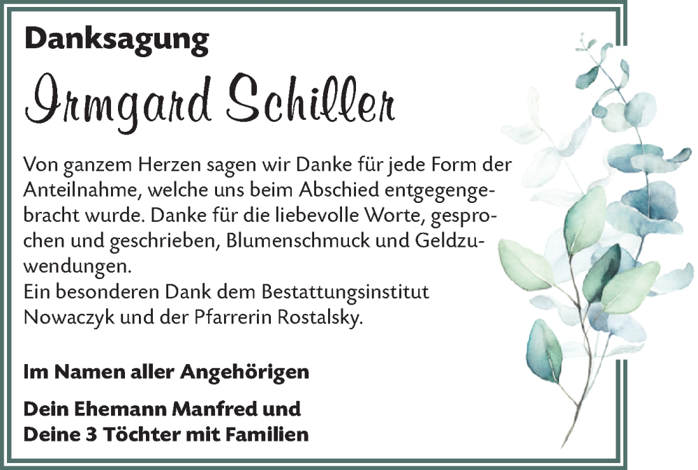 Hier finden Sie alle Traueranzeigen aus der Zeitung, die bisher für Irmgard Schiller erschienen sind. Weitere Traueranzeigen, die in der Zeitung erscheinen, werden hier ebenfalls aufgelistet